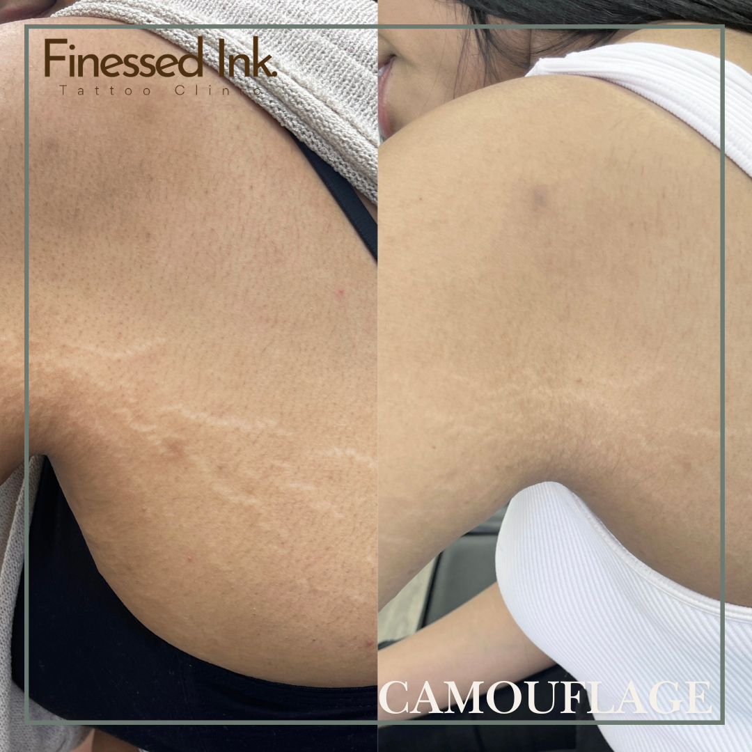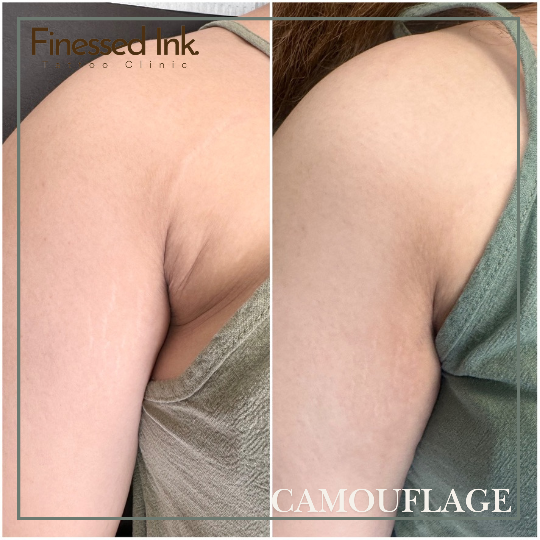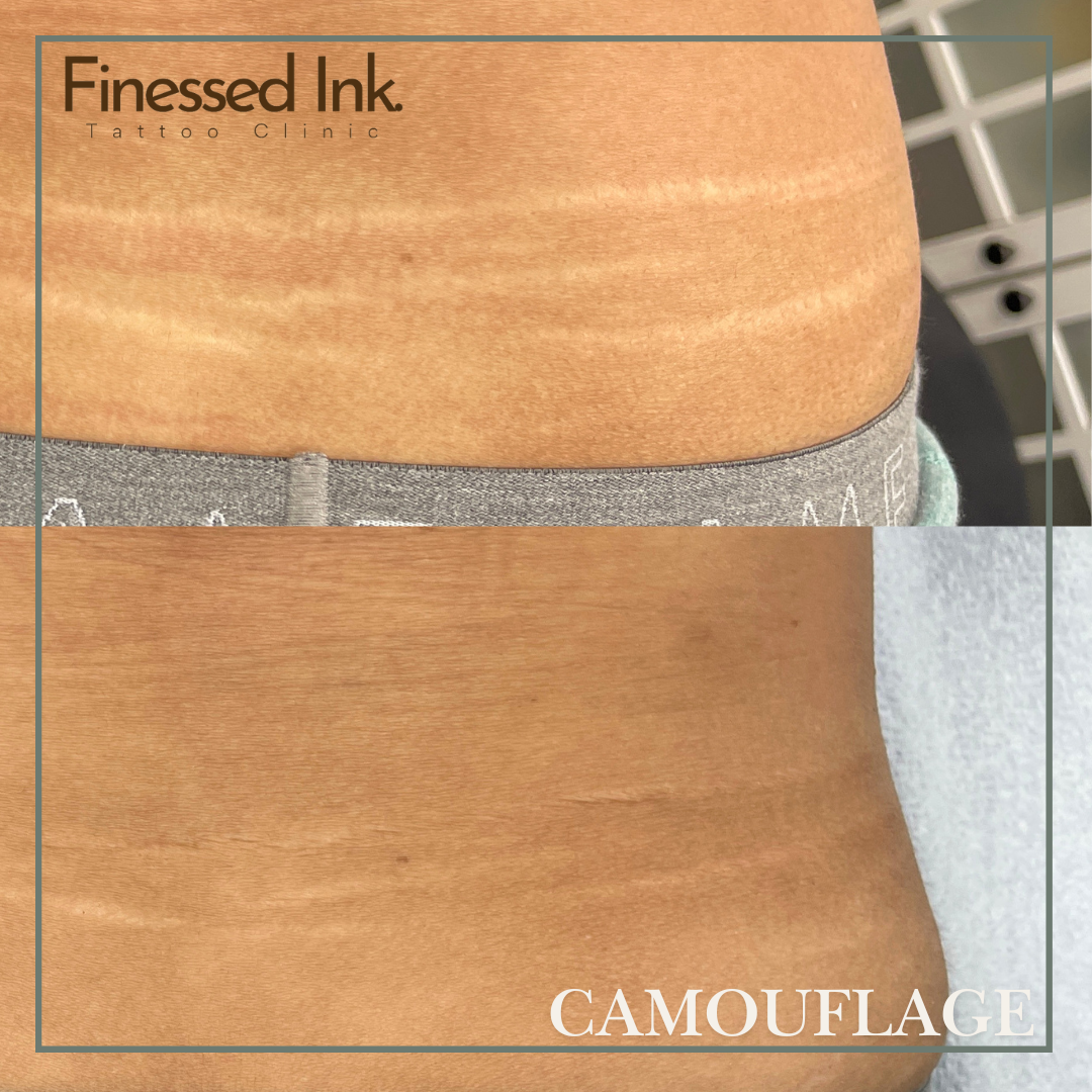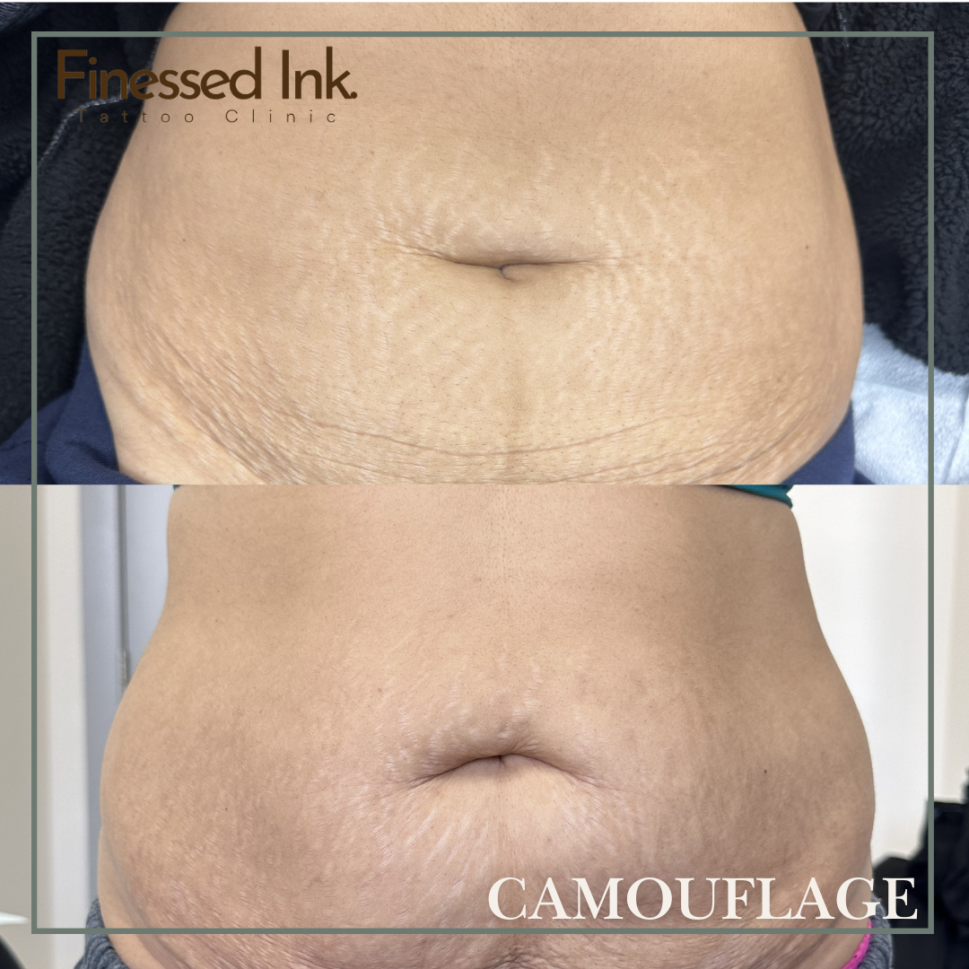 Stretch mark camouflage tattooing is a specialized non-surgical treatment that uses advanced pigmentation techniques to blend stretch marks into the surrounding skin, creating a smoother and more even appearance.